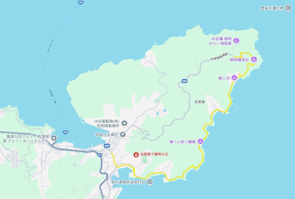ただ、現在も消火活動などを行っておりますので県道635号線(佐賀関循環道路)の海側の道路(地図中の黄色ライン)はお使いにはならずに、JX金属佐賀関製錬所正門前を通過する山側の道路をご利用下さるようお願いいたします。